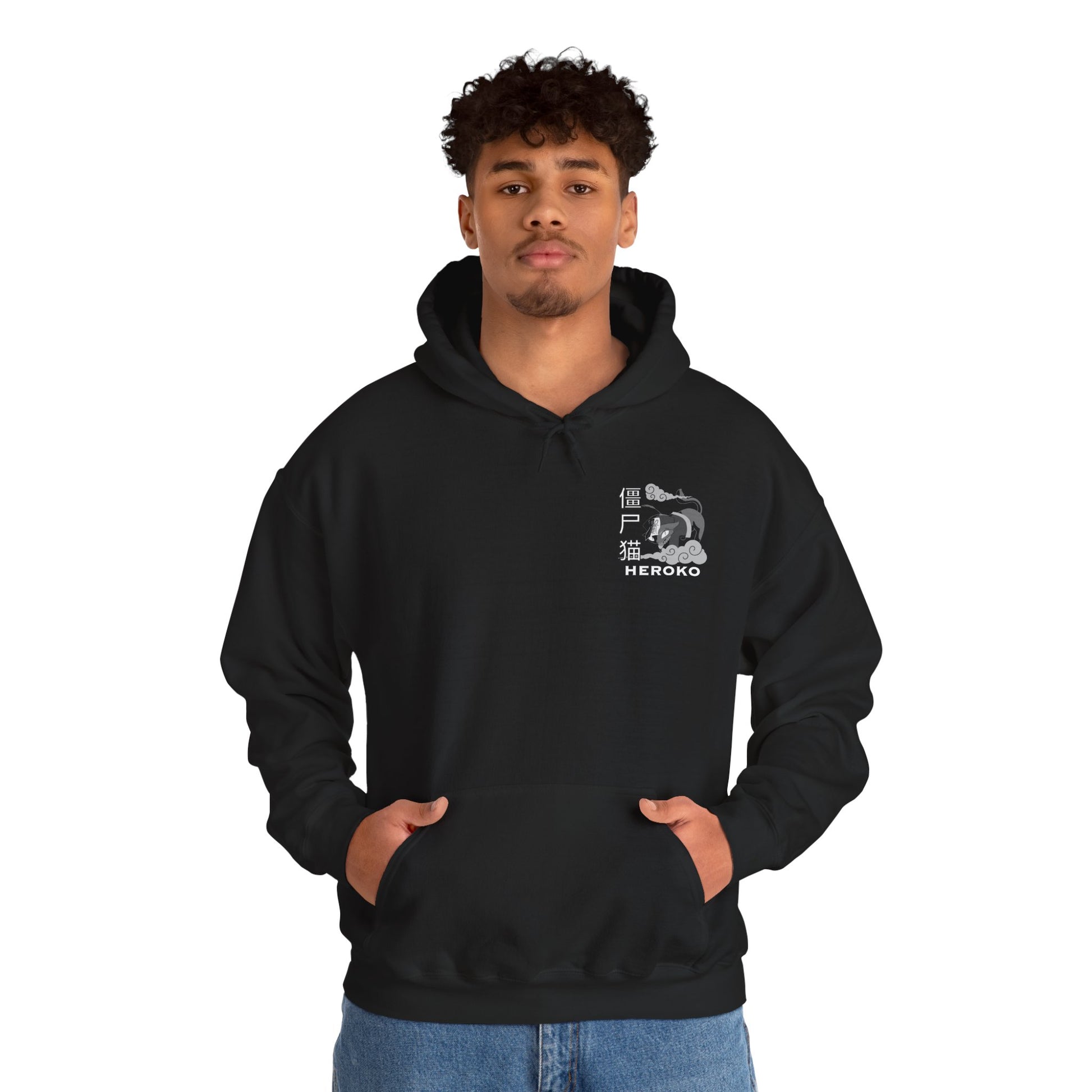 Spooky Unisex Hoodie, Chinese Ancient Zombie Cat B&W Design